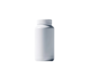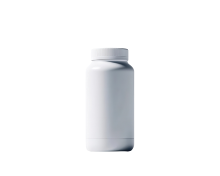 Plain white plastic pill bottle with a screw cap, commonly used for medicine or supplement storage, cut out transparent isolated PNG.