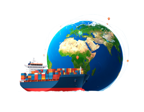 Global Logistics and Supply Chain Icon with Cargo Ship and Globe, Isolated PNG