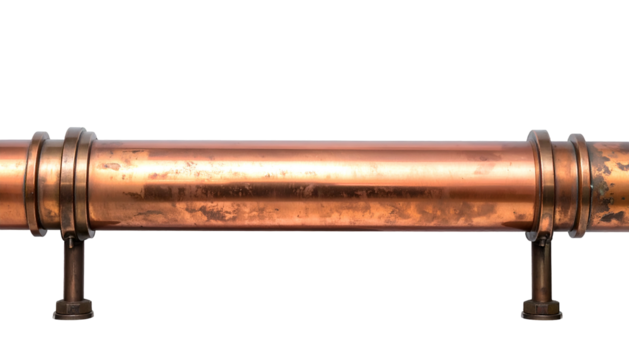Horizontal view of a copper pipe with two large rings, and two support legs