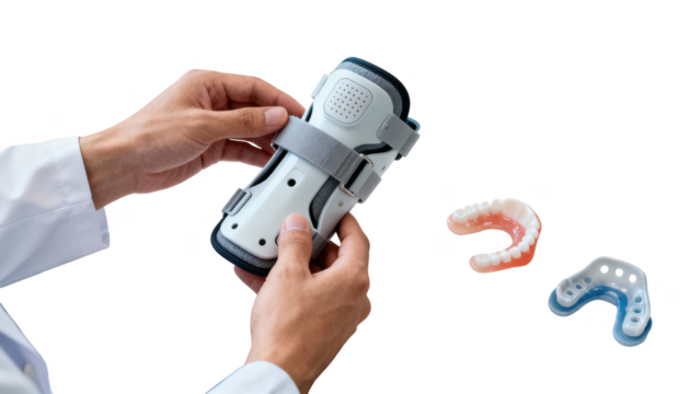 Clinicians hands holding a modern orthopedic brace next to alternative splints on a white desk showcasing options for longterm patient support during followup.
