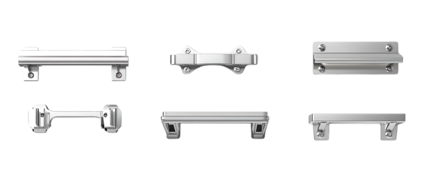 A Silver Metal Bracket With Four Holes and a Rivet on a Clear PNG or White Background.