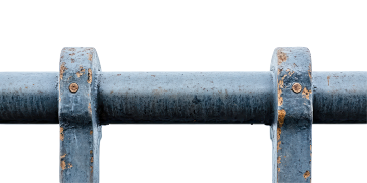 The image shows a close-up of a rusted blue metal pipe supported by two metal brackets.