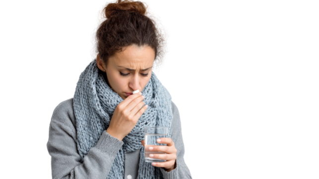 Sick woman in warm sweater taking medicine with water, isolated on white background.