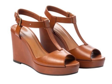 Brown leather wedge heeled sandals displayed on white background, stylish ankle strap design, perfect for summer and casual outfits.