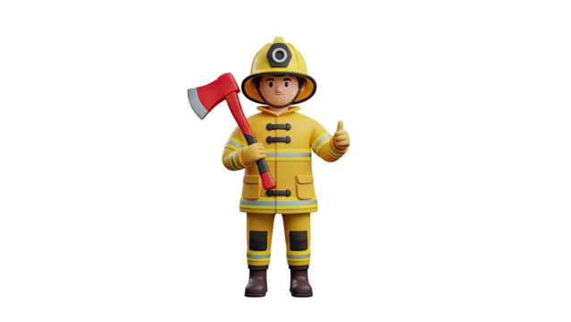 3D Firefighter Holding Axe and Giving Thumbs Up on transparent background