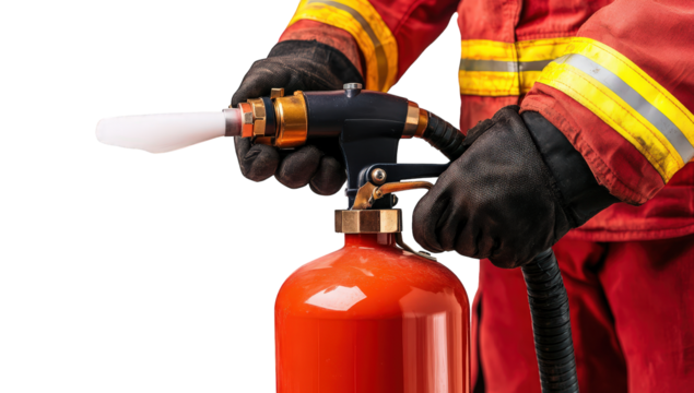 Red fire extinguisher isolated on a transparent background with hose and nozzle