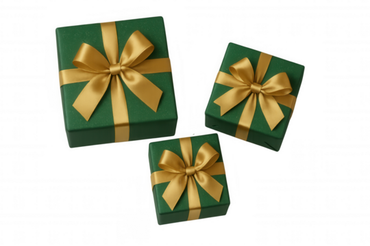 Three green gift boxes with golden ribbons and bows, bringing celebration and holiday spirit, on transparent background