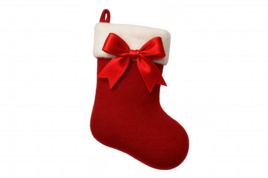Red christmas stocking with white faux fur cuff and bow, hanging for holiday celebration presents, transparent background