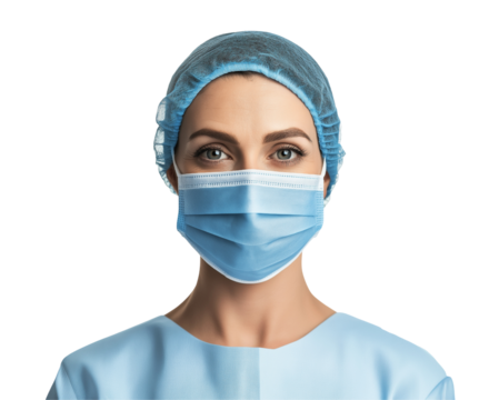 Young doctor wearing a surgical face mask and gesturing to her left Isolated on a PNG background.