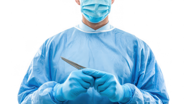 Surgeon dressed in medical scrubs, wearing a face mask and gloves, holding a scalpel with arms crossed, isolated on a transparent background for a clean and professional look