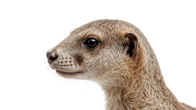 Meerkat profile portrait against white background highlighting whiskers fur and details of african mammal suricata suricatta
