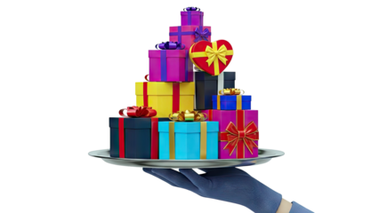Twelve colorful wrapped presents stacked in three rows against a solid for holiday mailing or delivery on transparent background