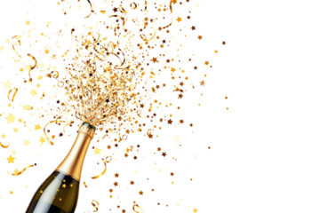 Champagne bottle popping with golden confetti and streamers on white background, isolated layout for celebration and party concept. Ai generative