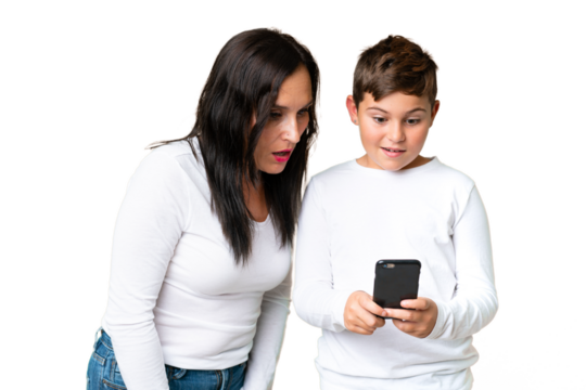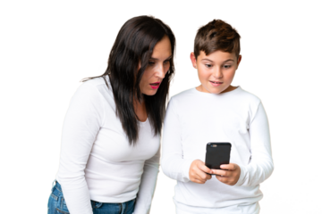 Little caucasian kid over isolated chroma key background sending a message or email with the mobile