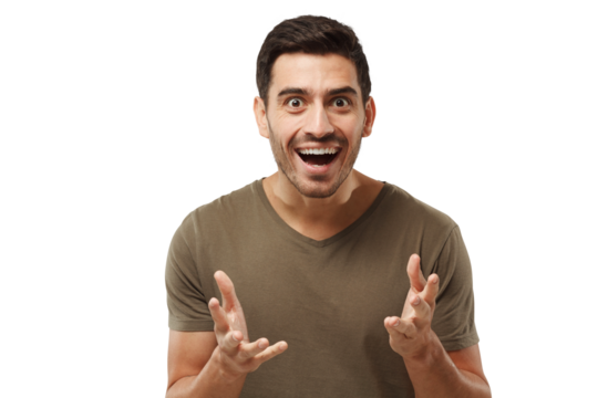 Scared young man with wide open mouth in shock against a transparent background looking handsome