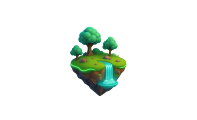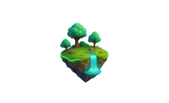 Whimsical floating island with lush green trees and a glowing waterfall cascading down its side isolated on transparent background