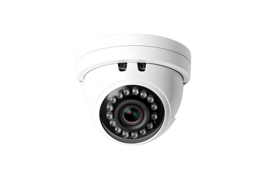 Indoor surveillance camera with white dome housing displayed on a crisp white transparent background