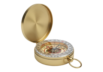 Brass compass with open lid and rotating needle on transparent background