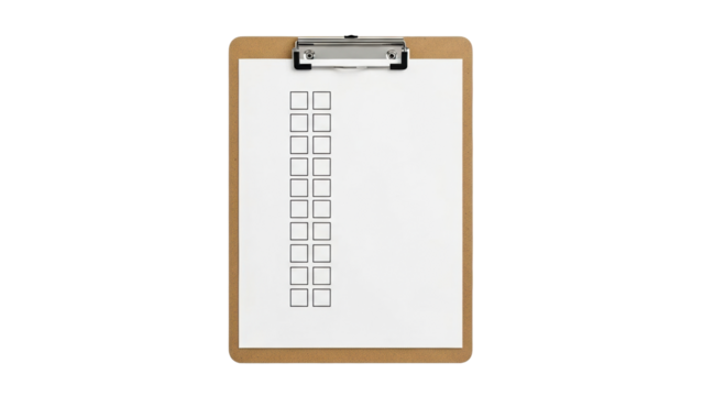 Professional clipboard with a blank white sheet of paper featuring a structured layout of empty checkboxes for task management, survey completion, or project planning applications.