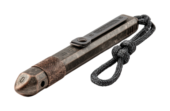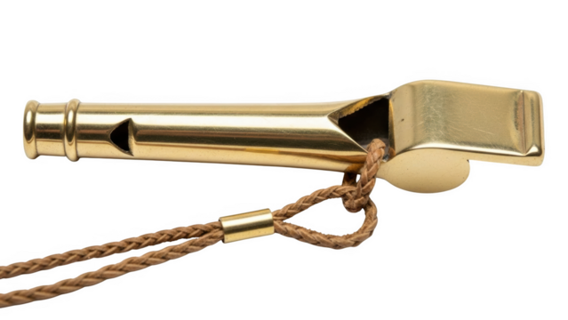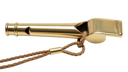 Shiny brass whistle with braided leather cord and gold metal accent on black background image