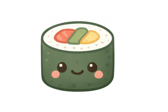 Adorable sushi roll character with big eyes and smile, a fun food illustration for kids menus or playful restaurant branding that brings joy and deliciousness