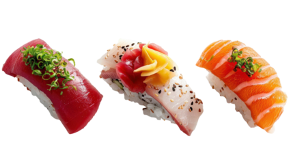 Colorful sushi platter featuring three types of nigiri with vibrant toppings on a white background