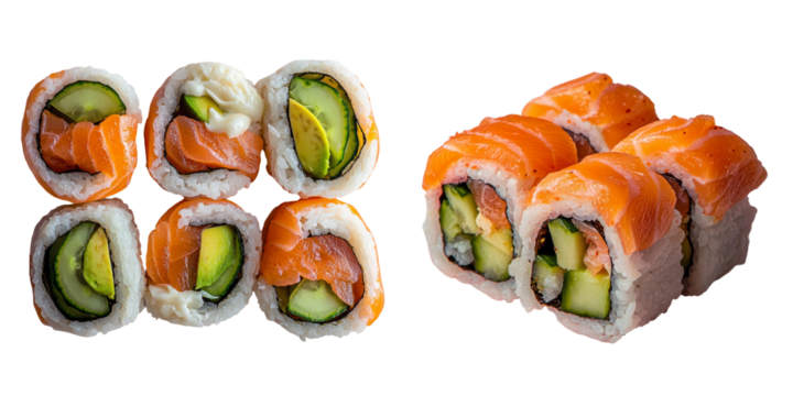 A close up of the srealistic sushi rolls with salmon and rice on transparent background.
