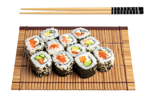 Sushi roll set on bamboo mat isolated on transparent background, japanese cuisine
