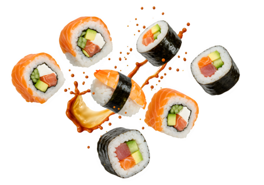 Falling sushi rolls with soy sauce splash, isolated on white or transparent background. PNG
