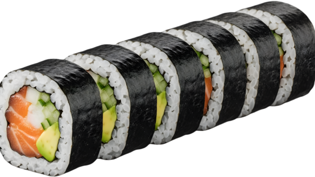 Delicious salmon sushi rolls with cucumber and carrot filling isolated on transparent background