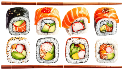 Fresh japanese sushi platter with variety of rolls on transparent background