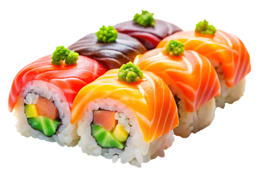 Realistic photo of assorted fresh sushi platter with salmon, tuna, and avocado rolls isolated on white background, perfect Japanese food concept.