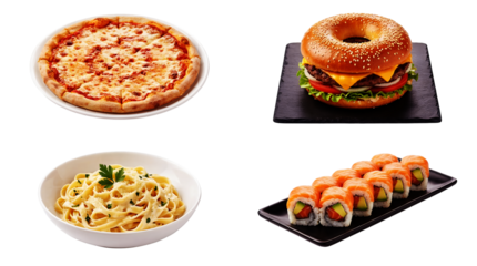 Margherita pizza, bagel burger, creamy pasta and salmon sushi rolls