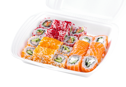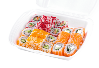 Sushi  roll assortment in takeout box, closeup object. Isolated on transparent background
