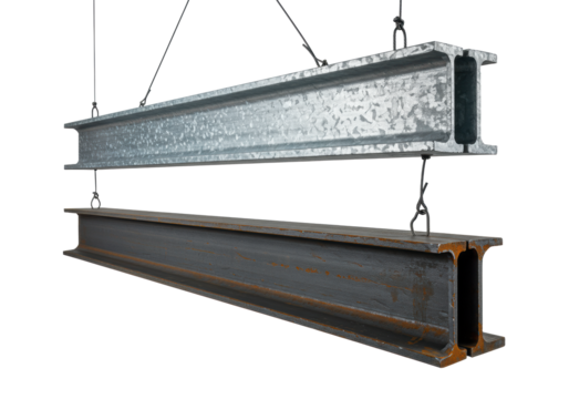 Three industrial steel i-beams, galvanized and untreated, suspended against a transparent cyclorama. Industrial material and engineering concept