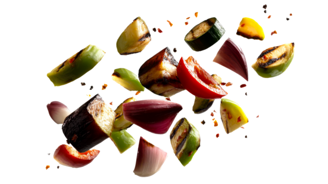 Appetizing grilled vegetables featuring bell peppers eggplant zucchini and red onion with aromatic spices dynamically suspended in motion ideal for culinary and healthy eating concepts