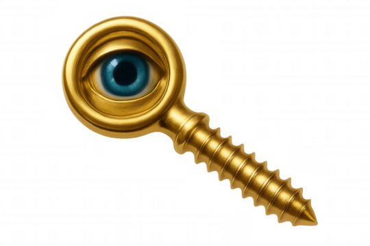 Golden screw featuring piercing blue eye, symbolizing surveillance and security awareness against transparent backdrop