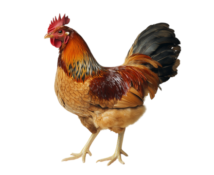 Speckled Sussex hen isolated on white background. Poultry farming and agriculture concept.