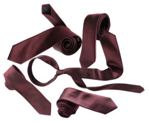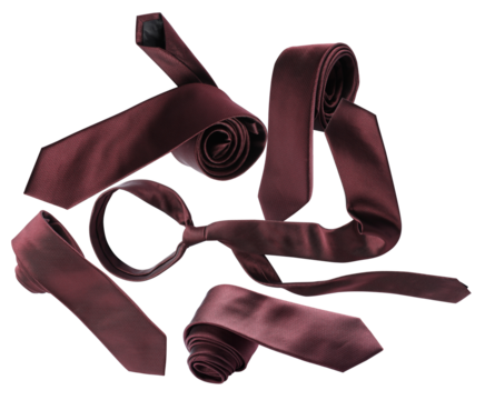 a collection of elegant burgundy silk ties, artfully arranged in various knots and folds on a transparent background, suitable for formal wear and accessories.