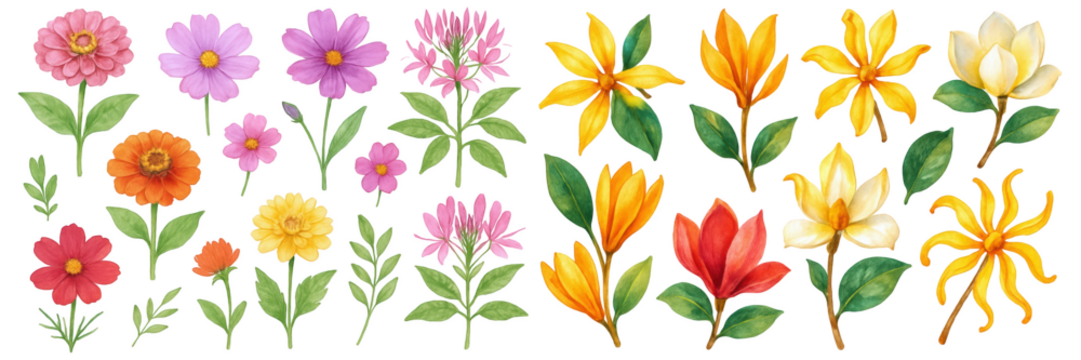 A vibrant collection of hand-drawn flowers in various colors and styles, perfect for design projects.