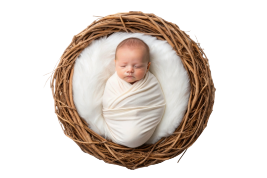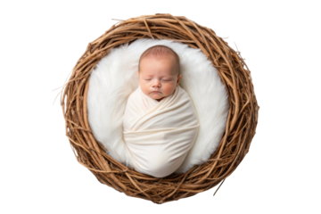 PNG Caucasian newborn swaddled in nest of twigs on fluffy cushion