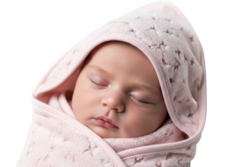Sleeping baby wrapped in a pink hooded blanket isolated on transparent background