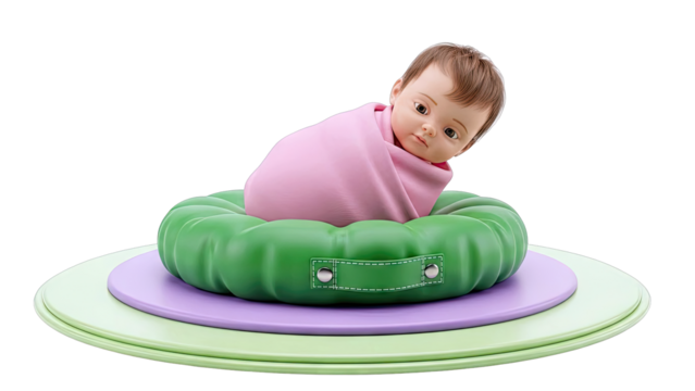 Baby Swaddled in Pink in a Green Pillow on Layered Platforms