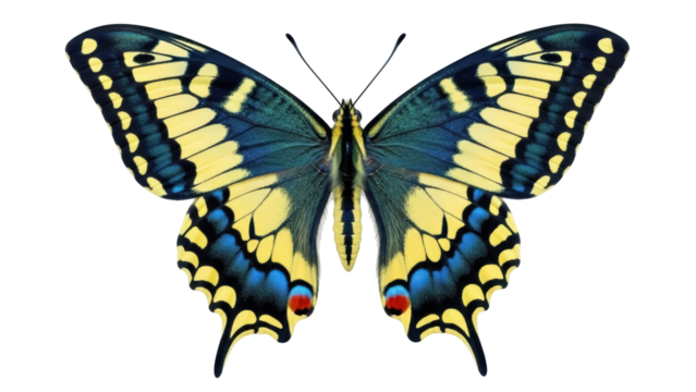 Isolated beautiful swallowtail butterfly showing its yellow, blue, and red patterned wings