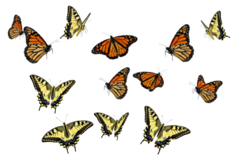 dynamic group of monarch and swallowtail butterflies in mid-flight, wings spread, vibrant orange, black, yellow, blue patterns, isolated on a pristine transparent studio background with no shadows,