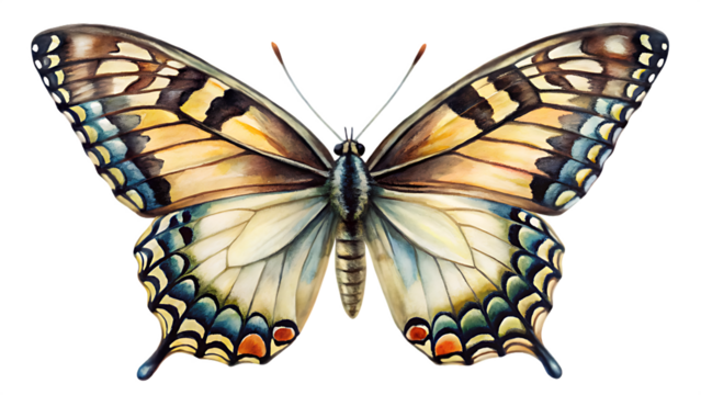 Watercolor illustration of a yellow swallowtail butterfly isolated on transparent background