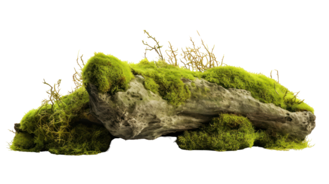 Green moss with dirt, soil and decorative stone, rock  isolated on transparent and white background.PNG image.