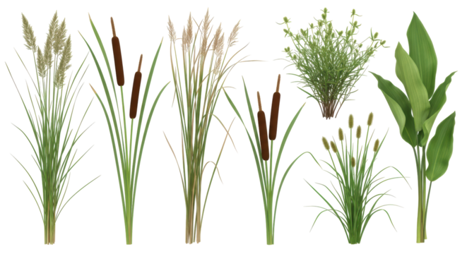 Floral Design Elements: Marsh Bush and Cattail Shrub on Transparent Background for Nature Themes