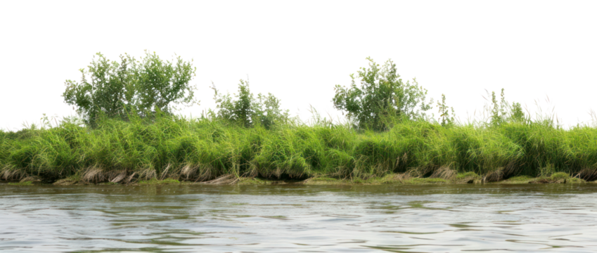 Natural arrangement of mixed wetland plants showing varying heights of grasses, reeds and small shrubs creating a marshy vegetation line isolated on white background