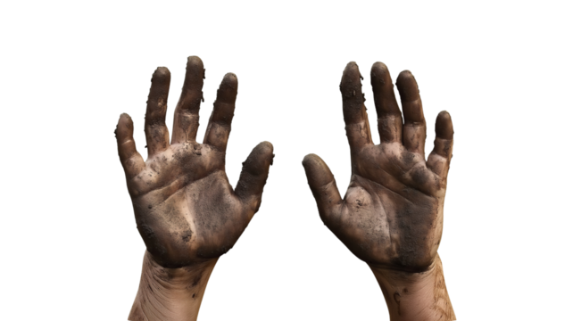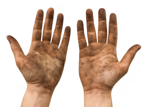 Dirty human hands with greasy grime and oil stains isolated on transparent background